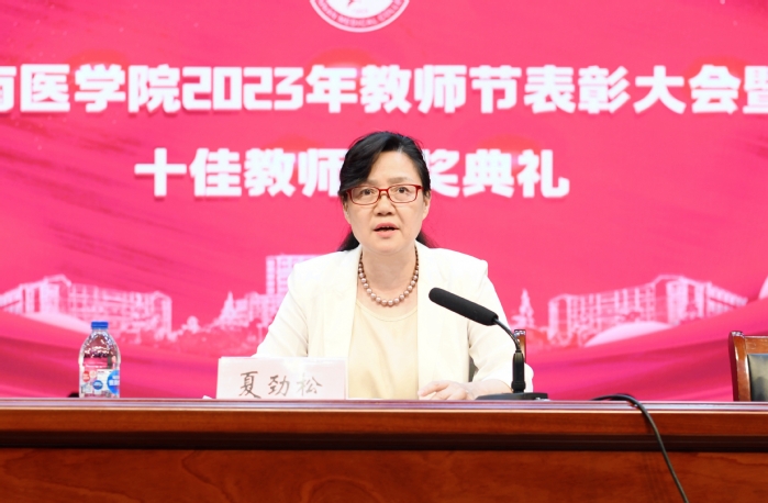 党委书记夏劲松代表校党政向全校教职医护员工表示节日的问候,向受到表彰的同志表示热烈的祝贺,向支持学校事业建设和发展的离退休老同志和30年教育工作者表示崇高的敬意。她指出,学校坚持以习近平新时代中国特色社会主义思想和党的二十大精神为指导,坚持立德树人根本任务,坚守为党育人、为国育才的初心使命,锚定更名大学、审核评估和博士学位授予单位立项建设目标任务,学校发展取得显著成绩,涌现出一批爱岗敬业、甘于奉献、改革创新的先进典型。她强调,全校上下要向受表彰的教师学习,学习他们对党忠诚、信念坚定的政治品格,扎根讲台、潜心治学,甘为人梯、诲人不倦的奉献精神和自我革新、终身学习、精益求精、勇攀高峰的创新精神。