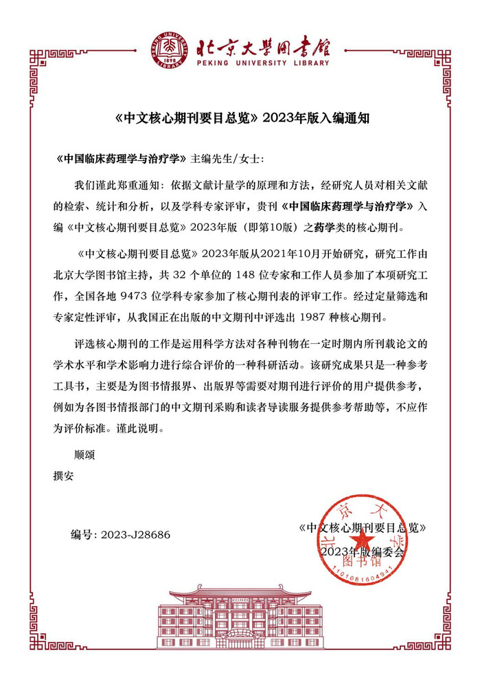 12月26日,北京大学图书馆发布《中文核心期刊要目总览》2023年版(第10版),我校第一附属医院《中国临床药理学与治疗学》入选“药学”类核心期刊。这是《中国临床药理学与治疗学》继中国科技核心期刊、中国科学引文数据库(CSCD)核心库收录期刊后取得的又一成绩。