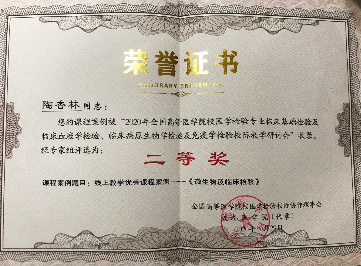 来自全国60多所高校的200余名代表参会。会议前半部分为全国医学检验界的知名专家就国内疫情防控下以及新时代、新医科背景下,检验医学学科建设与教育改革、课程思政建设以及线上资源开发和利用等方面的热点、焦点问题分享了宝贵经验和思考。会议后半部分为线上优秀课程和微课制作竞赛,全国40多所医学院校的100多个作品参加了比赛。经过线上评选和专家评委会的现场评比,我校选送的三个作品均取得了优异的成绩,陶香林老师的线上教学优秀课程案例《微生物及临床检验》获竞赛二等奖,李婕、黄建军老师选送的作品《临床隐球菌检验》和《II型超敏反应的机制与检验》分别获得微课制作大赛二等奖和三等奖。会议期间,通过参会单位投票选举,我校还成功入选全国高等医学院校医学检验专业校际协作会临床病原生物学检验及免疫学检验专业学组常务理事单位。