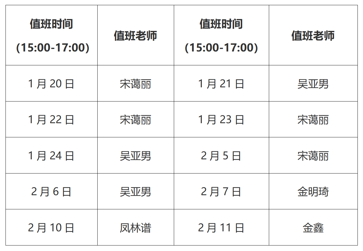 1.值班时间:2025年1月20日-1月24日、2月5 日-2月11日,每日的15:00-17:00。